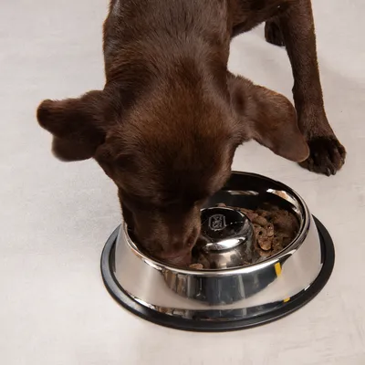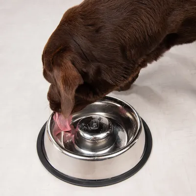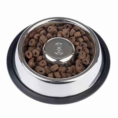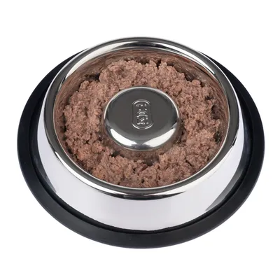 Inovativní miska pro psy s funkcí zabraňující hltání, odnímatelný protiskluzový gumový okraj, vyrobená z odolné, hygienické a antibakteriální nerezové oceli, nízká hmotnost, snadné čištění