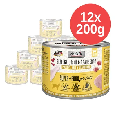 MAC's Cat je vysoce kvalitní mokré krmivo pro všechny kočky, které je obzvláště vhodné pro kočky citlivé na výživu. MAC's nabízí recepturu zcela bez obilovin, která neobsahuje lepek ani sóju. Velmi vysoký podíl nejjemnějšího masa nabízí přirozenou chuť a zajišťuje nejlepší přijetí. V krmivu není použita žádná živočišná nebo kostní moučka ani formované maso, ale pouze nejlepší kousky například srdce, jater nebo plic. Všechna krmiva obsahují navíc taurin, který je pro kočky nezbytný a podporuje silný zrak a zdravou funkci srdce. Šetrná příprava a důležité vitamíny a cenné minerály krmivo doplňují a poskytují vaší kočce vyváženou stravu s přirozenou chutí. Vyrobeno v Německu.Nyní ve výhodném balení 12 x 200 g!