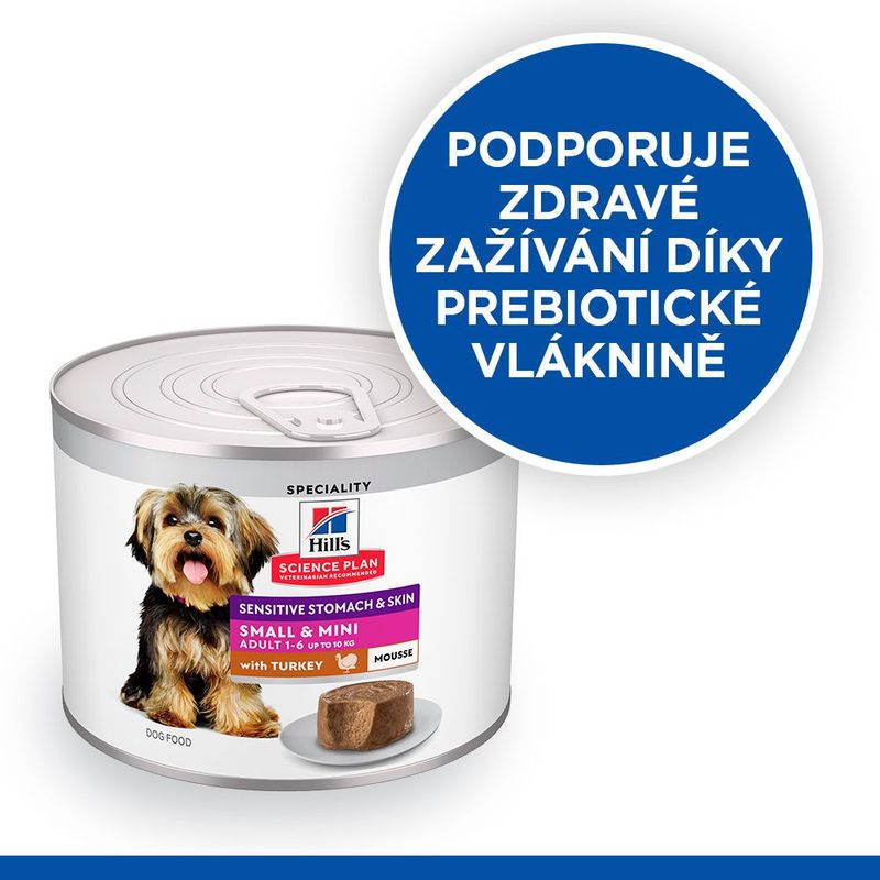 Hill's Science Plan Sensitive Stomach & Skin Small & Mini Mousse je kompletní krmivo pro psy.